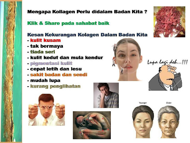 ~:: Peratusan kolagen dlm badan kita akan berkurangan mengikut usia. Untuk menggantikan kolagen yg HILANG disarankan mengambil RUMPAI LAUT ASLI (PURE MARINE COLLAGEN - PMC).